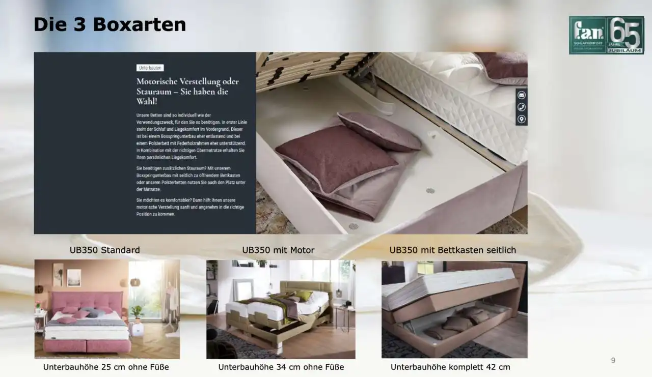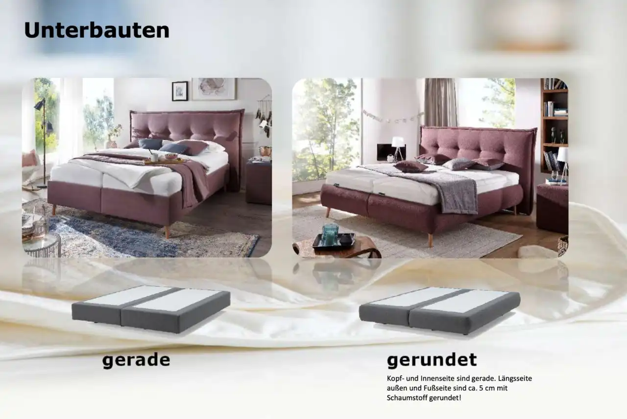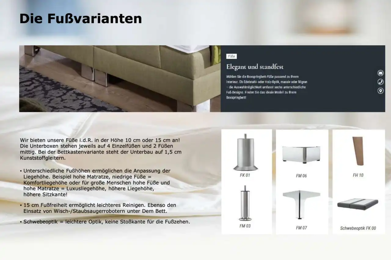 wahlweise eckig (Standard) oder gerundet (Stellmaß + 4,5 cm !) mit Kunststoff-Füßen 10 oder 15 cm, weitere Füße oder schwebende Ausführung preisgleich Höhe Box ohne Füße: 25 cm - bei Motorischer Verstellung keine gerundeten Boxen möglich!