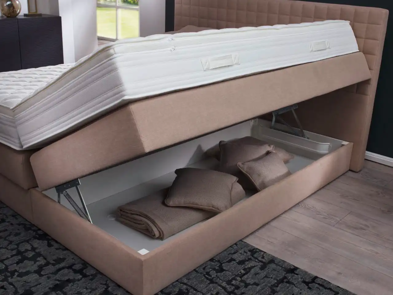 Äußerst praktisch ist die Variante mit Bettkasten, der mittels Zugfedern seitlich zu öffnen ist und für das verstauen von Bettwäsche, Tagesdecken o.ä. ideal geeignet ist. Dieses Variante ist ab einer Bettbreite von 160 cm verfügbar. Natürlich können Sie das Boxspringbett auch als elektrisch verstellbare Variante für alle Größen konfigurieren.