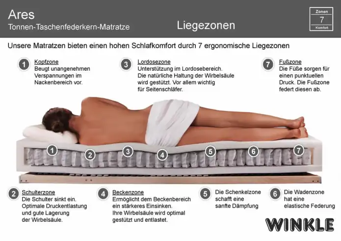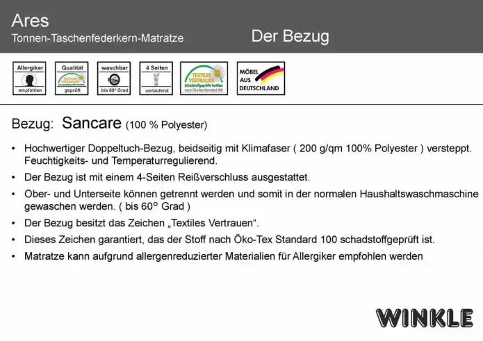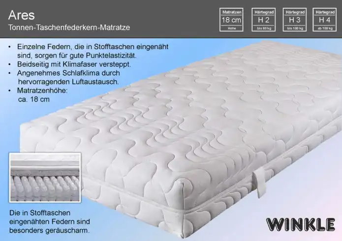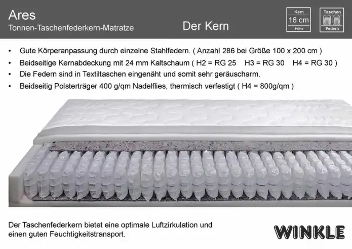 - Matratzenkern: wahlweise Bonellfederkern Brisbane, ca. 17 cm hoch oder Taschenfederkern Ares ca. 18 cm hoch.