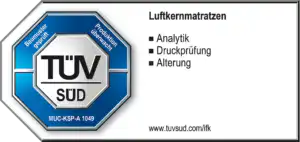 Die klinisch getestete Matratze und der Luftkern inkl. Öl-Vital® Liquidpad wurden vom TÜV SÜD einer Belastungsprüfung inkl. Alterung unterzogen und bescheinigt.