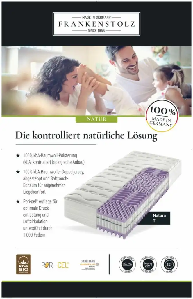 Hergestellt aus natürlichen Materialien bietet Dir die Natural Flow Matratze – unsere natürliche Matratze – gesunden Schlaf und erholsame Nächte, in denen Du der Natur nah bist. Die 7-Zonen-Pori-cel®-Tonnentaschenfederkern-Matratze “Frankenstolz Natura T” ist so natürlich, so weiche so nachhaltig und damit die kontrolliert natürliche Lösung!