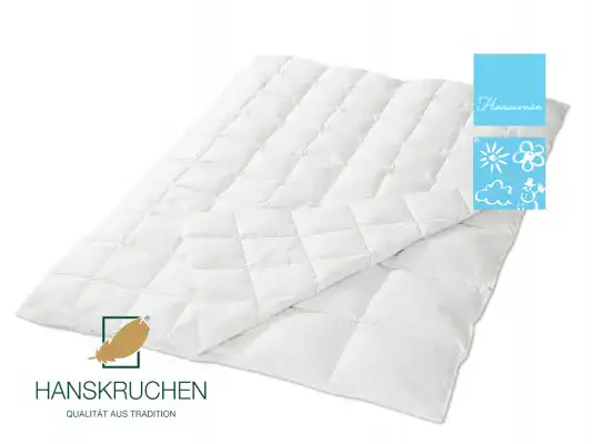 Unsere Daunendecke Harmonie 4-Jahreszeiten ist eine Kombidecke und besteht aus 2 Decken, einer Dauneneinziehdecke und einer Kassettendecke, die miteinander verknüpft sind. In der warmen Jahreszeit können Sie die Decke einfach auseinanderknüpfen und in der kälteren Zeit ganz leicht wieder miteinander verbinden. Die Füllung besteht aus 90% weißen polnischen neuen Gänsedaunen und 10% Federchen der Klasse I. Die Daunen sind umhüllt in feinem Bezug aus 100% Baumwolle und genäht in feinster 100er Daunenperkal.
